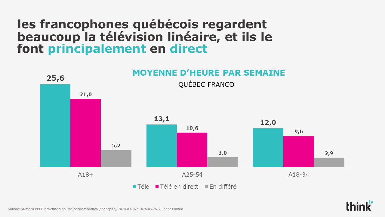 - les Québécois francophones regardent plus la télévision (près de 26 heures par semaine) et passent moins de temps à regarder les plateformes de diffusion en continu que le Canadien moyen (16 % du temps total consacré à la vidéo)