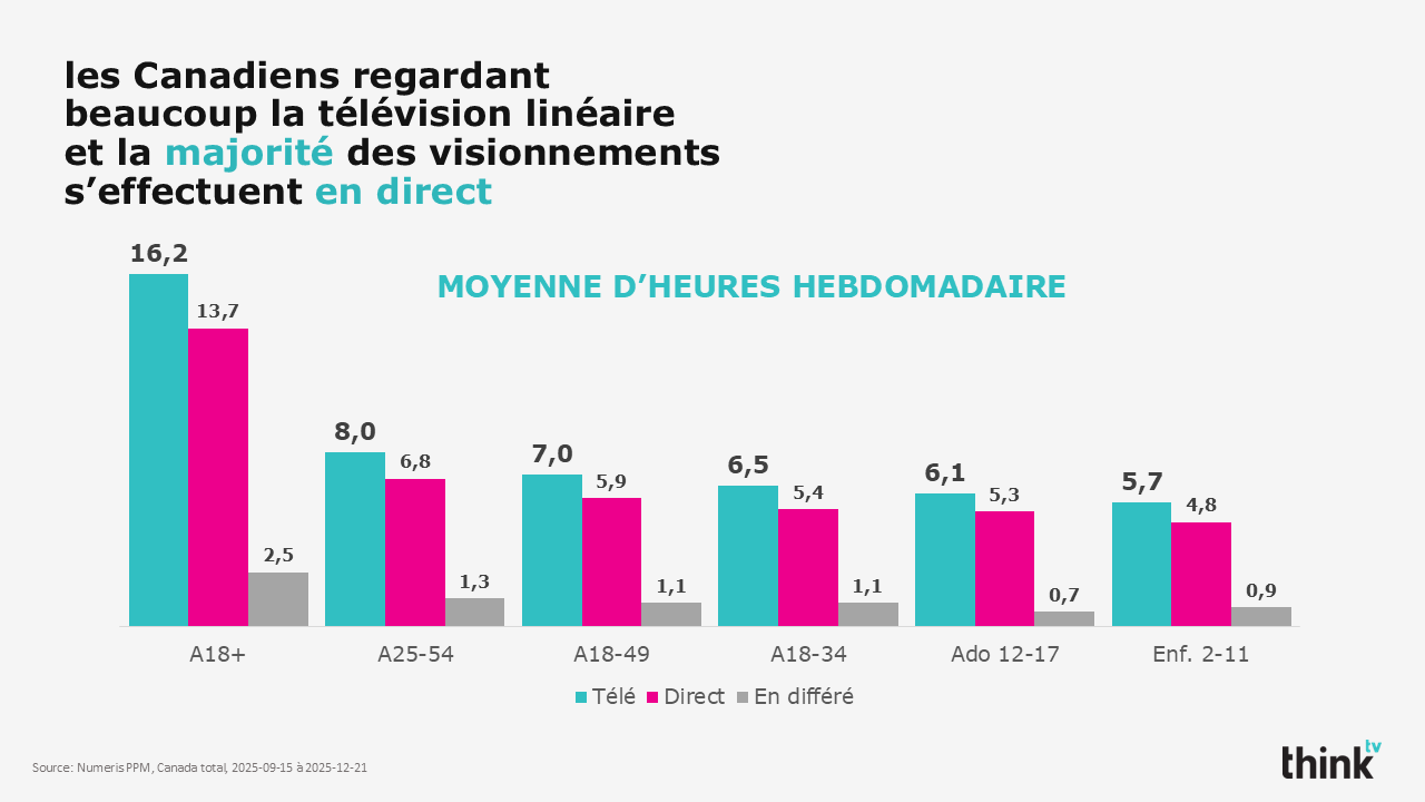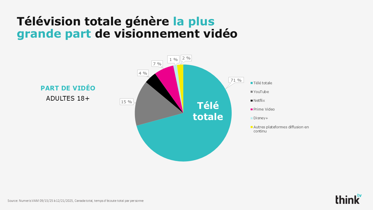 - Temps passé : la télévision domine le temps passé devant la vidéo. L’ensemble de l’écoute de la télévision représente 71 % du temps passé à regarder la vidéo, dépassant largement YouTube et toutes les plateformes de diffusion en continu combinées. La semaine dernière seulement, les Canadiens (2+) ont regardé 589 millions d’heures de télévision linéaire.