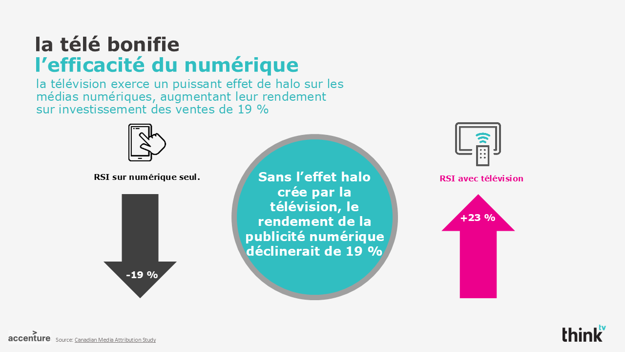 - Efficacité : La publicité télévisée offre un rendement sur investissement supérieur à court et à long terme, et produit un effet de halo significatif sur d’autres médias, en particulier les médias numériques (augmentant le rendement des ventes provenant de médias numériques de 19 %).