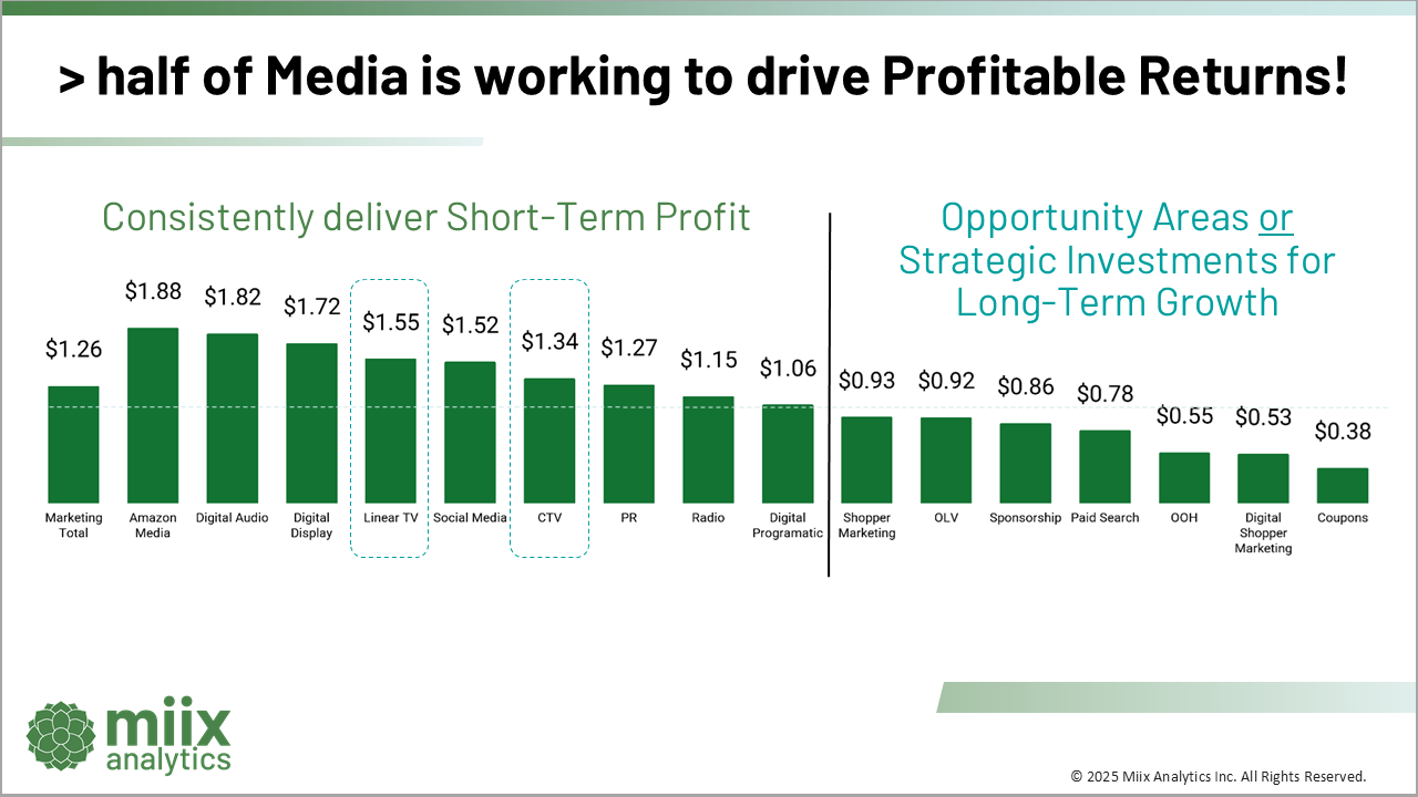 - Advertising yields results! Media spend in Canada delivers on average $1.26 short-term profit per $1 invested; Linear TV delivers outsized profit at $1.55, and remains a massive profit engine, responsible for ~50% of profit despite being only 40% of spend.
