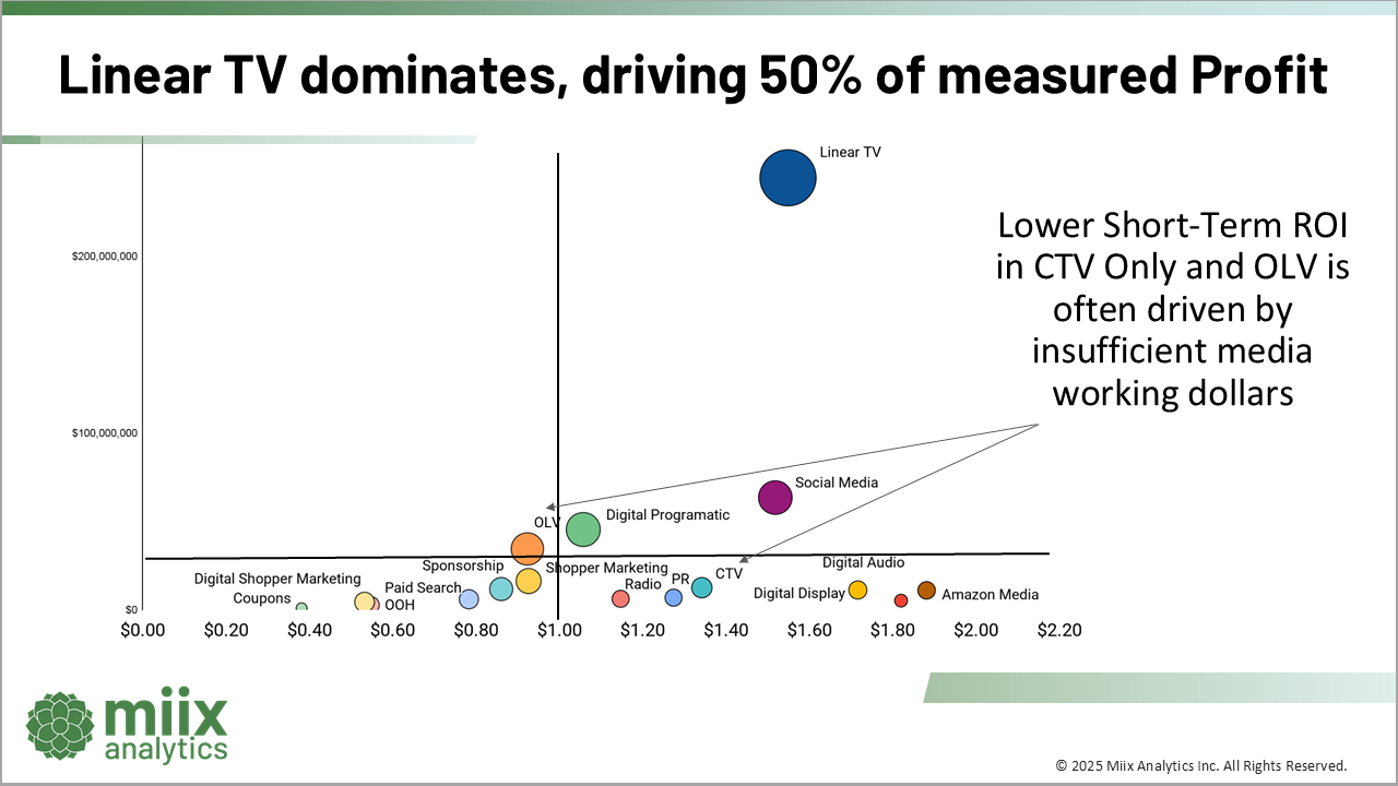 - When it comes to Connected TV, Hilary advises marketers to partner CTV with Linear, as her findings show that CTV alone will significantly under perform a Linear TV buy (CTV on its own delivers half of Linear’s profit ROI).