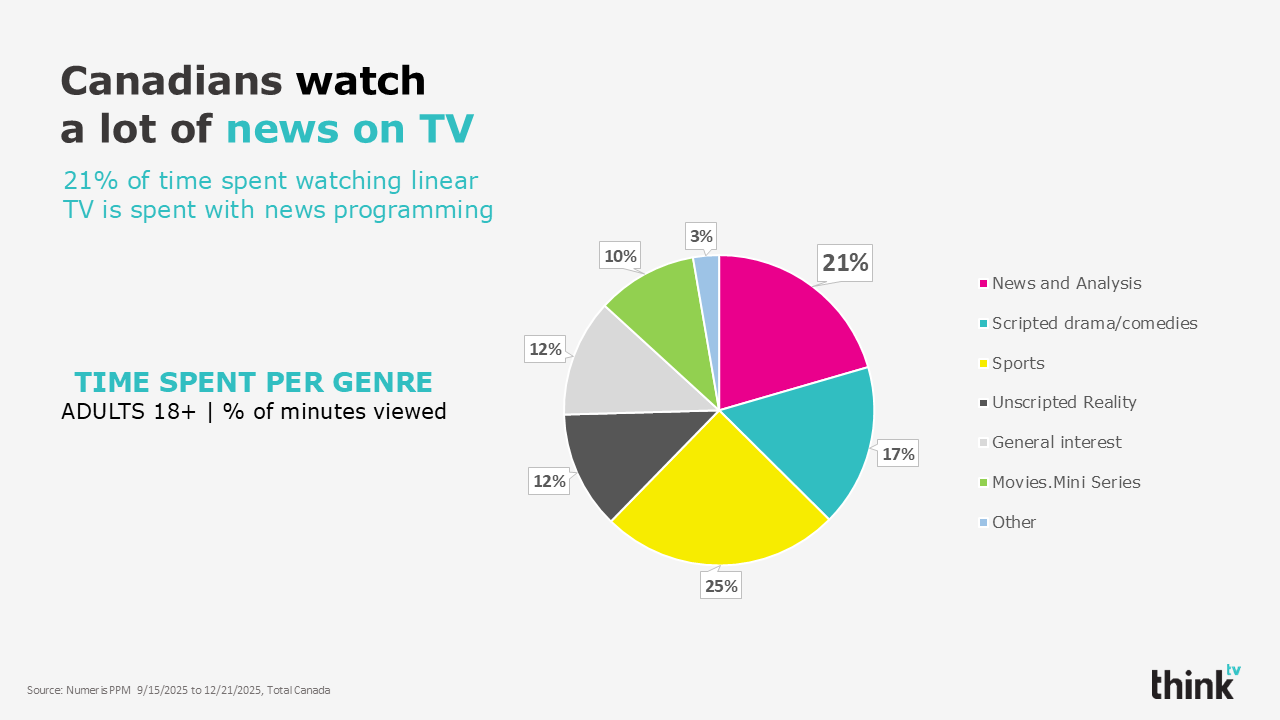 - News accounts for 21% of all TV viewing time (24% among Quebec Francophones)